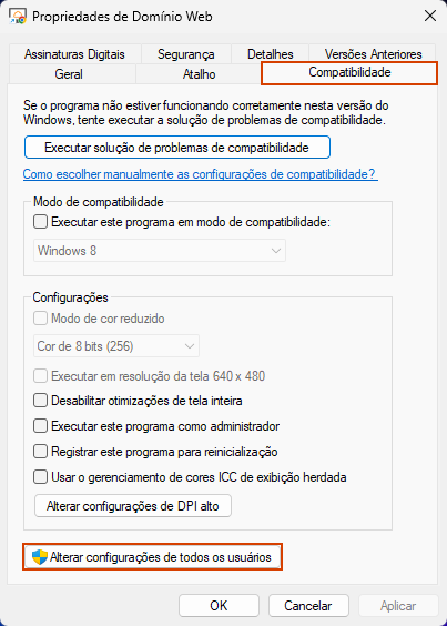 5. Vá até a aba Compatibilidade > [Alterar configurações de todos os usuários];