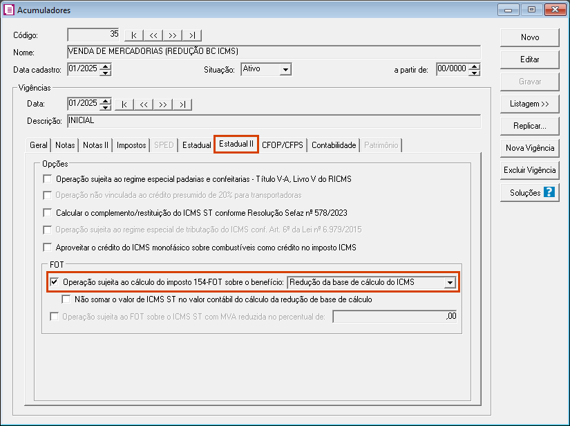 5. Na guia Estadual II, quadro FOT, marque a opção '[x] Operação sujeita ao cálculo do imposto 154-FOT sobre o benefício', e ao lado 'Redução de base de cálculo do ICMS';