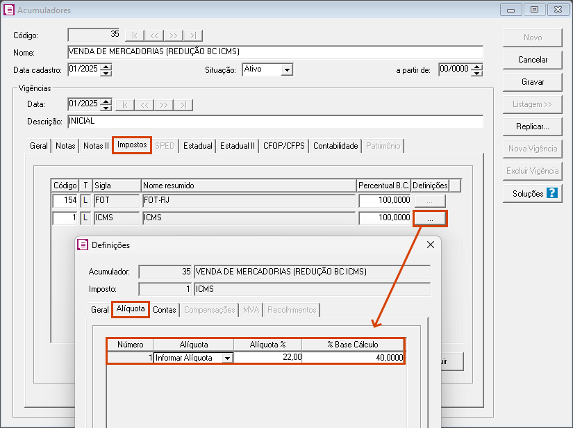 3. Na linha do imposto '1-ICMS', clique no botão '[...] Reticências', informe as alíquotas e base de cálculo;