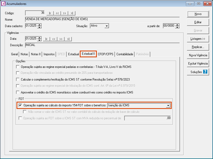 3. Na guia Estadual II, quadro FOT, marque a opção '[x] Operação sujeita ao cálculo do imposto 154-FOT sobre o benefício', e ao lado 'Isenção do ICMS';