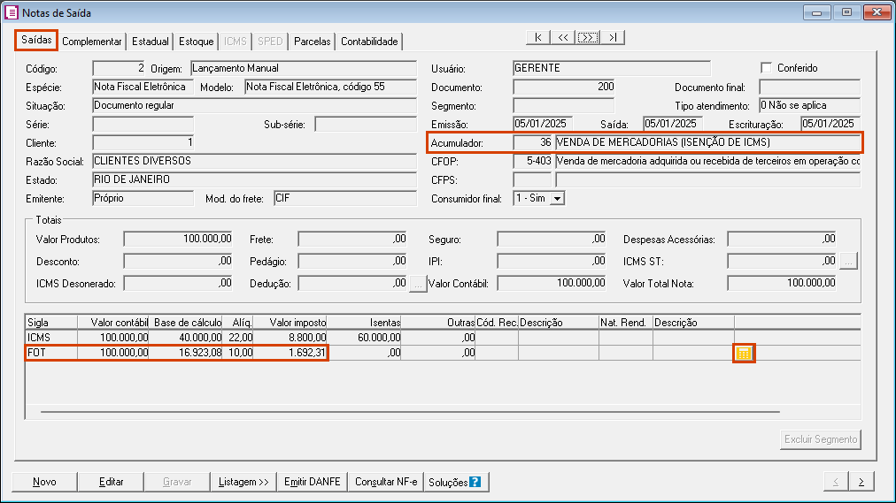 1. Acesse o menu Movimentos > Saídas e realize o lançamento com o acumulador configurado anteriormente;