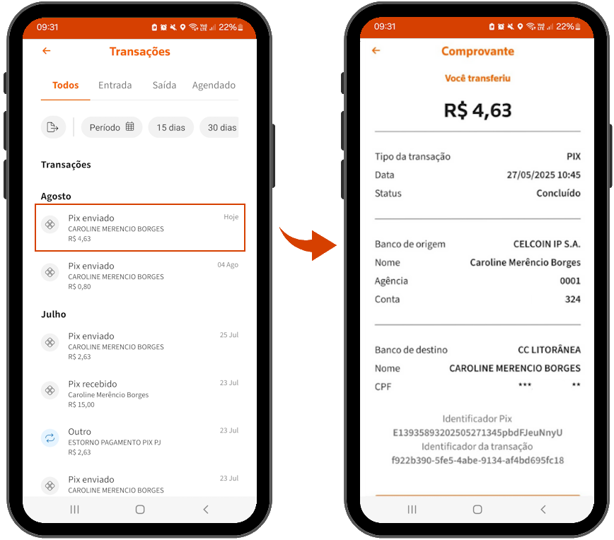 3. Ao clicar em uma transação, é possível visualizar os dados e Compartilhar o comprovante;
