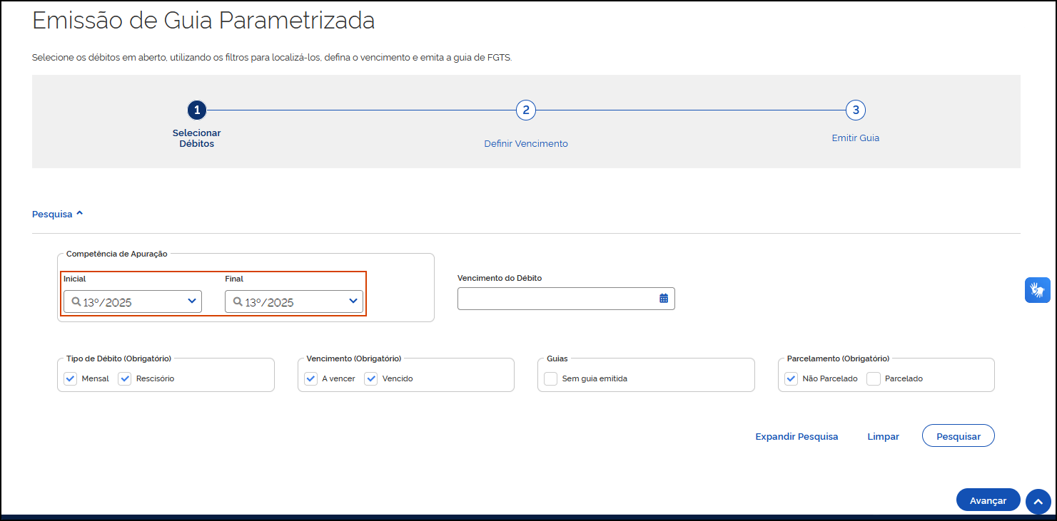 2. No quadro Competência de Apuração, selecione nos campos Inicial e Final, apenas a competência '13°/2024', selecione o Tipo de Débito Mensal, no quadro Vencimento selecione A vencer e Vencido;