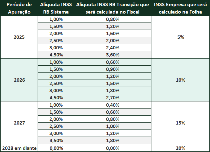 • 2026: 60% da alíquota CPRB + 10% sobre a folha;