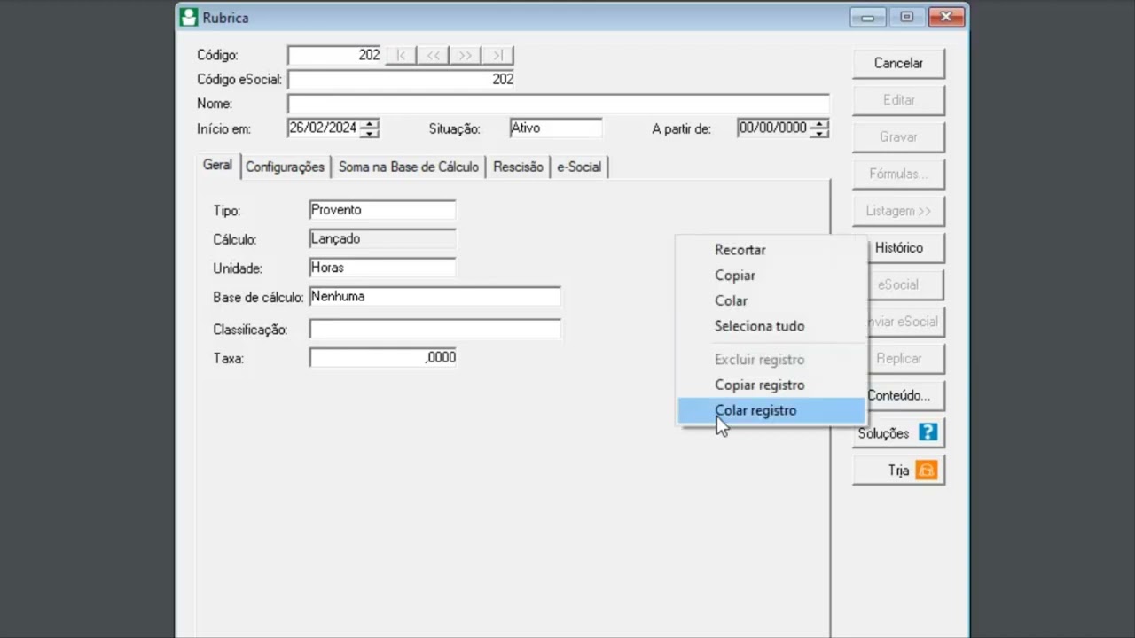 Para facilitar a criação de novas rubricas e garantir a consistência dos cadastros, recomenda-se utilizar a função 'Copiar registro/Colar registro'. Basta clicar com o botão direito do mouse no registro desejado, selecionar Copiar registro, clicar em [Novo] e então Colar registro com o botão direito. Em seguida, realizar as alterações necessárias para o cálculo da rubrica. Você também pode usar Excluir registro para remover uma rubrica não utilizada em lançamentos anteriores.