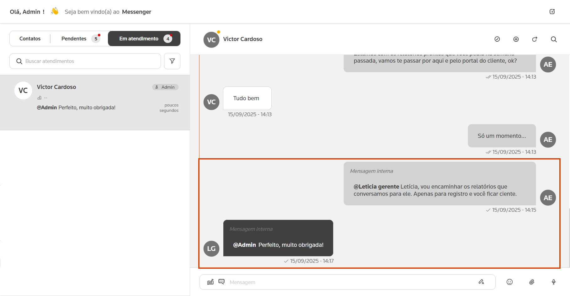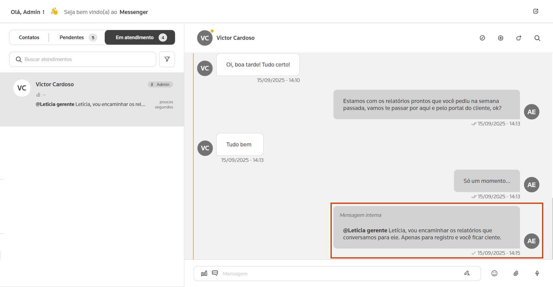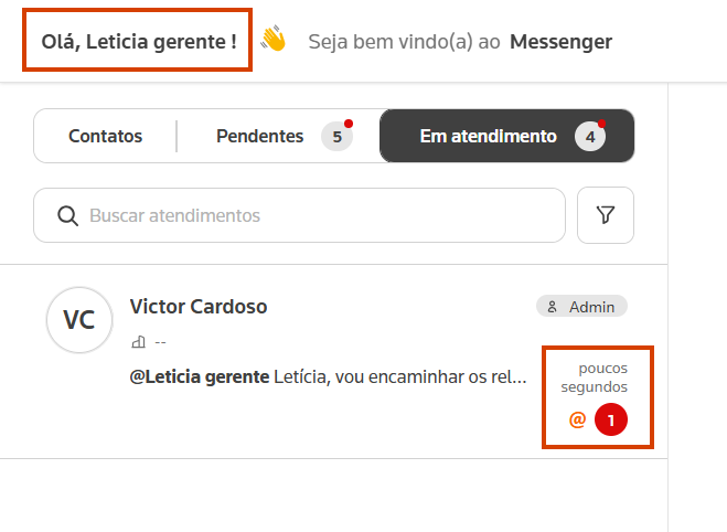 • O contato/grupo aparecerá na guia "Em atendimento" para o usuário mencionado, independentemente do perfil (usuário/gerente).