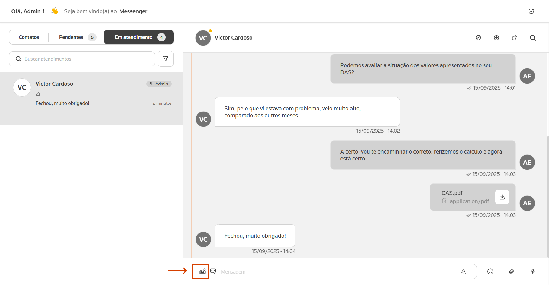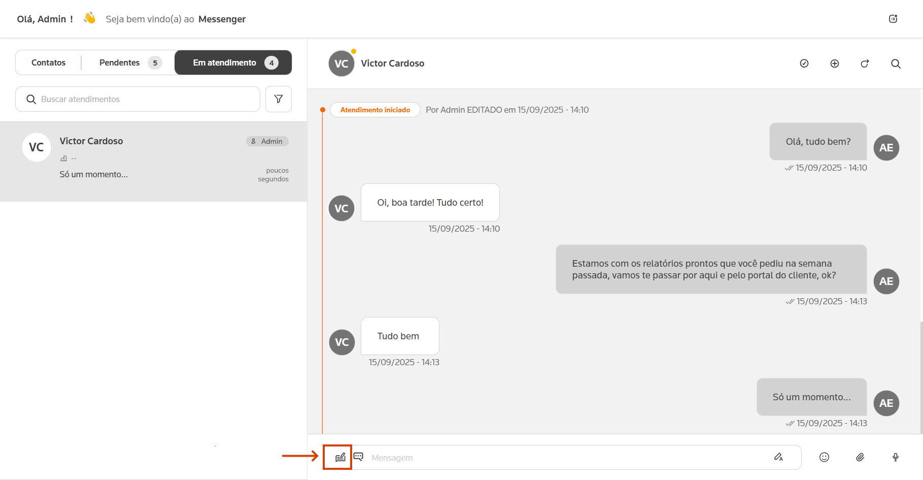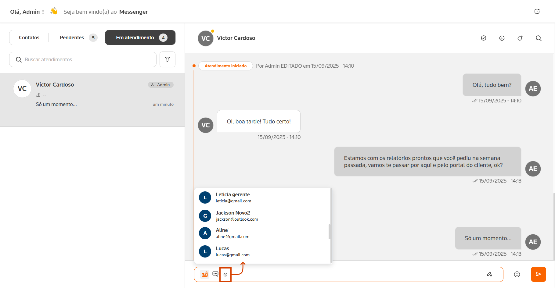 • O contato/grupo aparecerá na guia "Em atendimento" para o usuário mencionado, independentemente do perfil (usuário/gerente).
