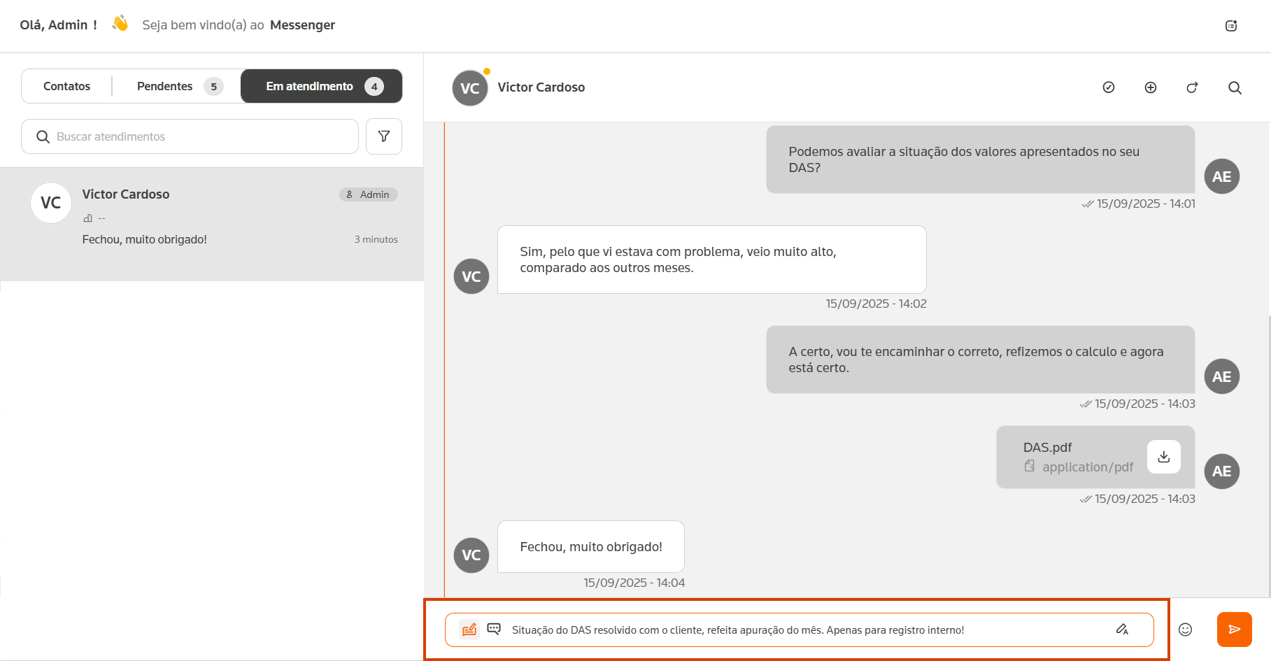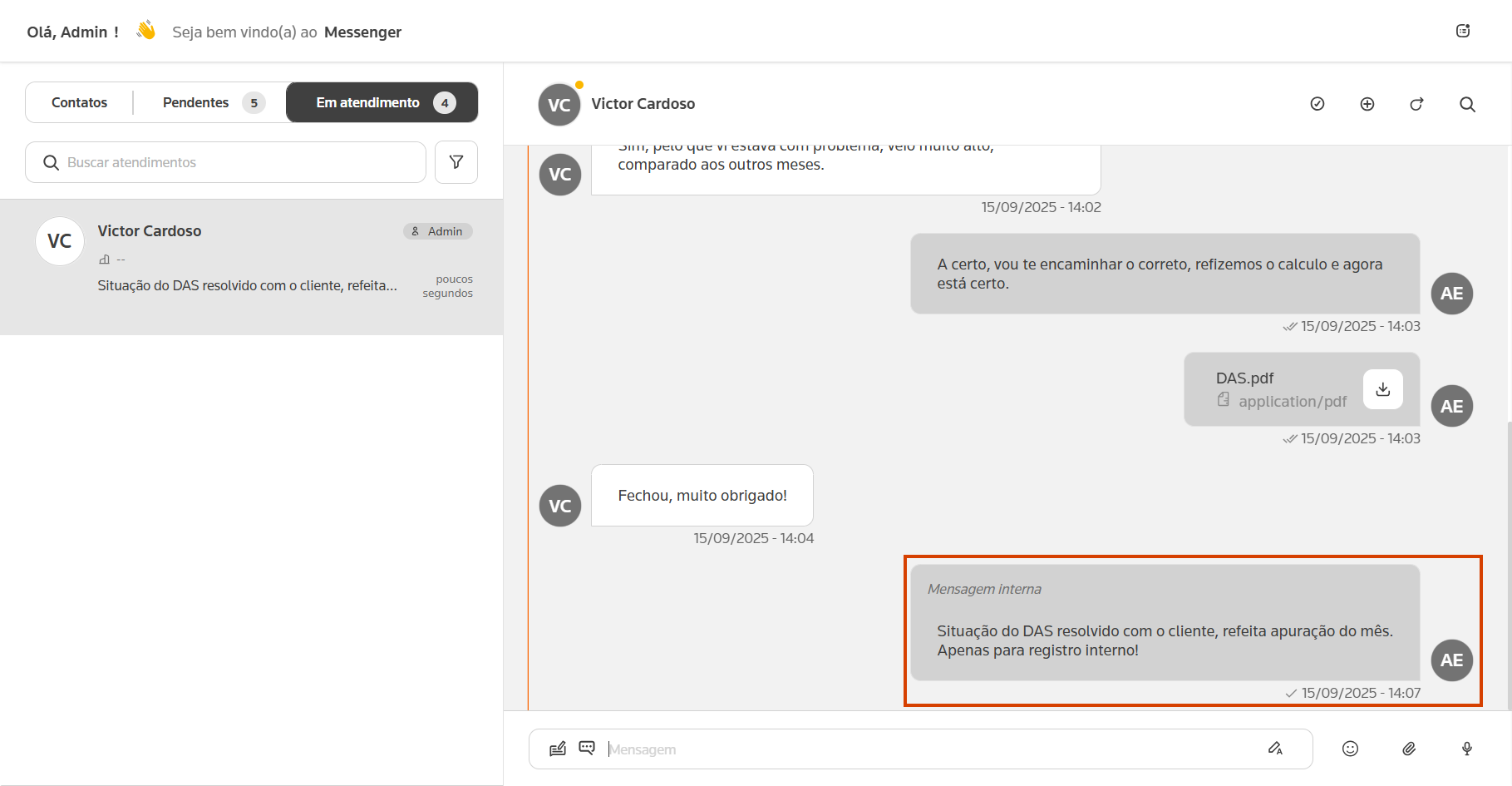 • O comentário ficará visível no chat, destacado como "Mensagem interna".