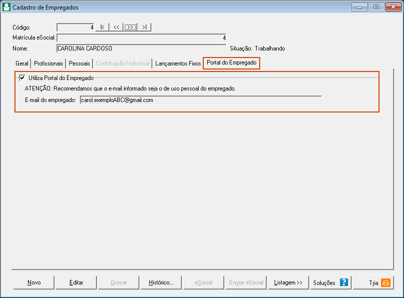 3. Marque a opção ‘[x] Utiliza Portal do Empregado’ e informe o e-mail do colaborador.