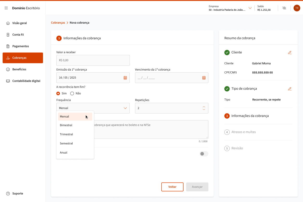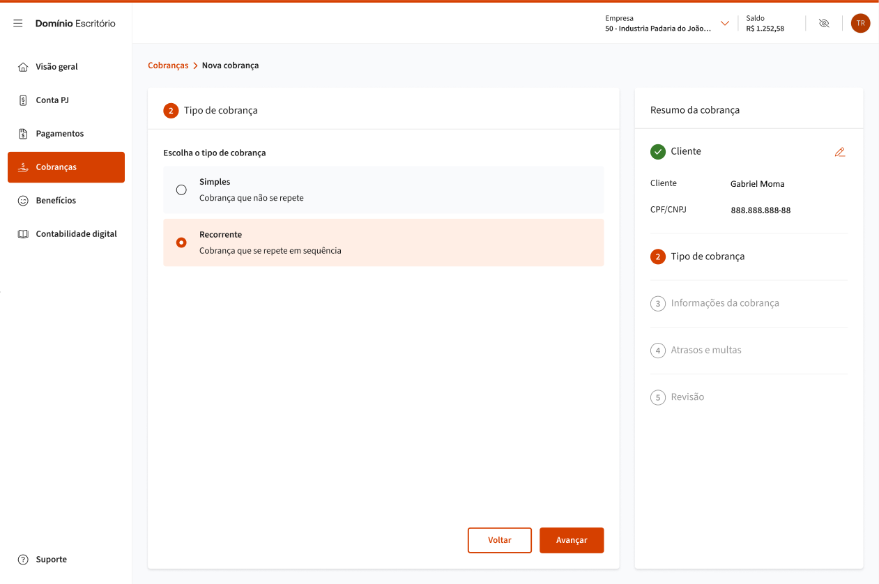 4. Marque a opção '[x] Recorrente - Cobrança que se repete em sequência' e clique em [Avançar];