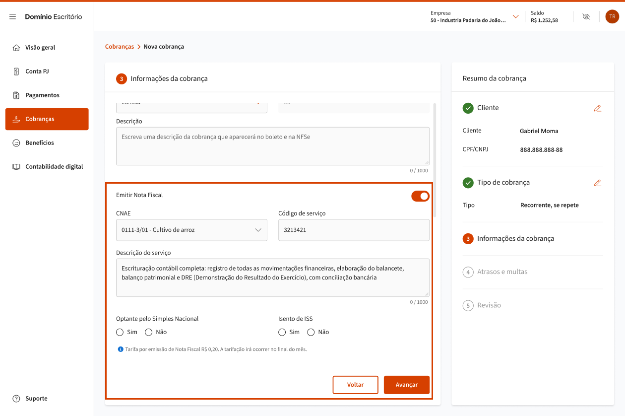 1. Se desejar emitir nota fiscal junto à cobrança, habilite a opção correspondente;