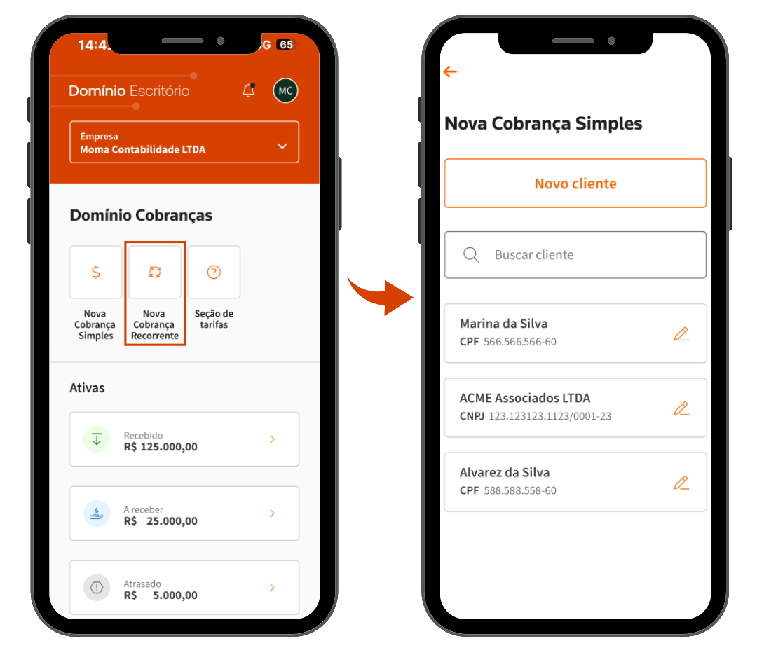 3. Após cadastrar os clientes, selecione o cliente que irá receber a cobrança;