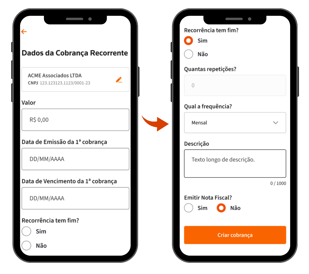 6. Indique se a recorrência terá fim. Se sim, informe a frequência e o número de repetições. Caso opte por não ter fim, a cobrança será gerada todo mês automaticamente conforme a data informada;