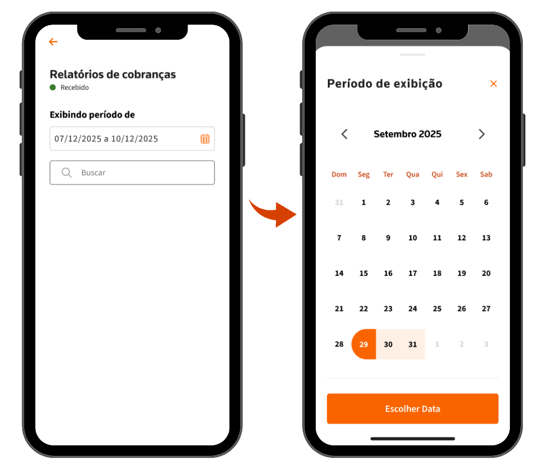 2. Utilize o campo 'Exibindo período de' para selecionar uma data específica e visualizar as cobranças desse período;
