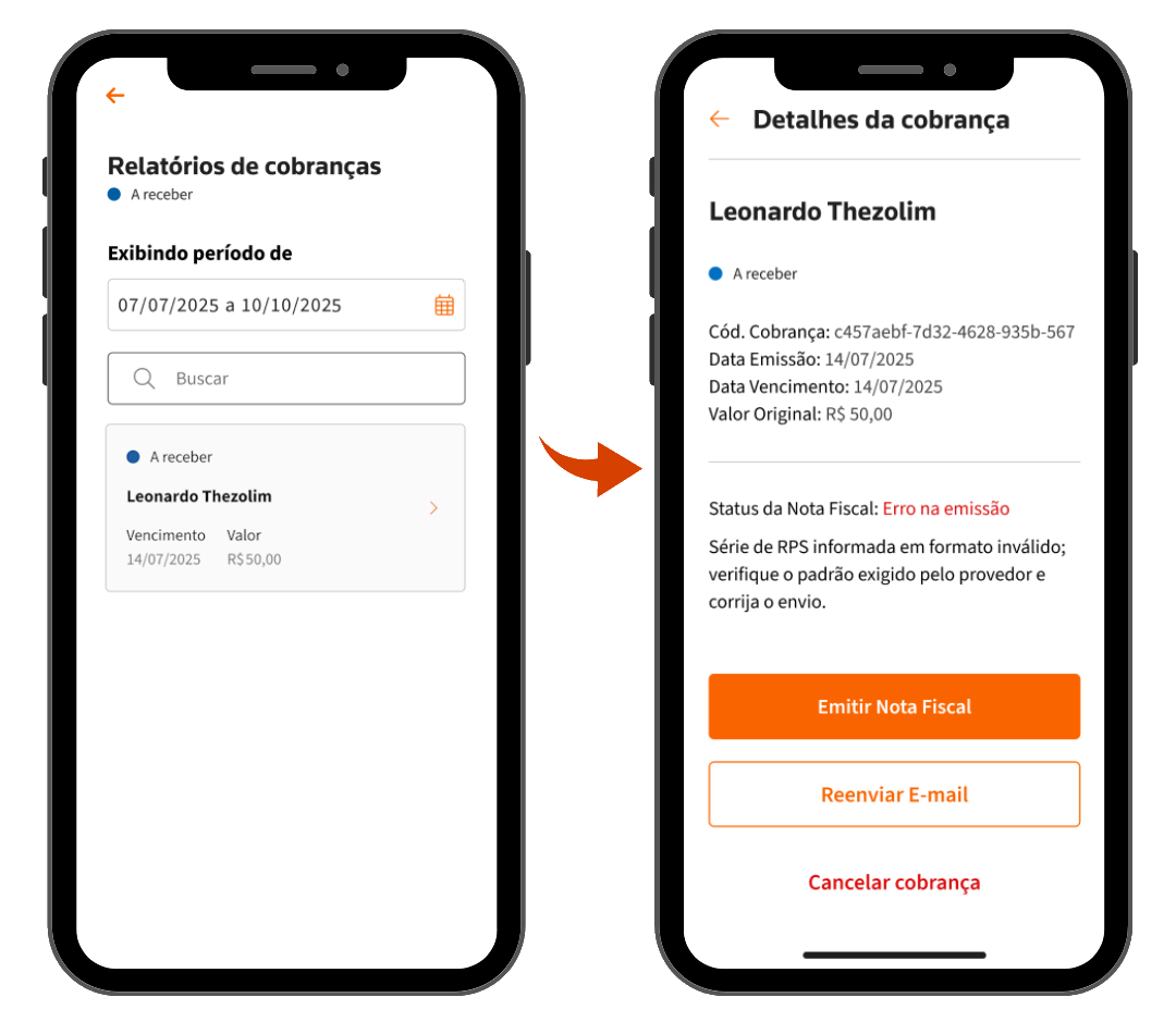 No Super App Domínio Cobranças, é possível emitir um relatório das cobranças recebidas e a receber, incluindo a opção de emitir a Nota Fiscal caso tenha ocorrido erro na tentativa anterior, além das futuras cobranças recorrentes. Para isso, siga os passos: