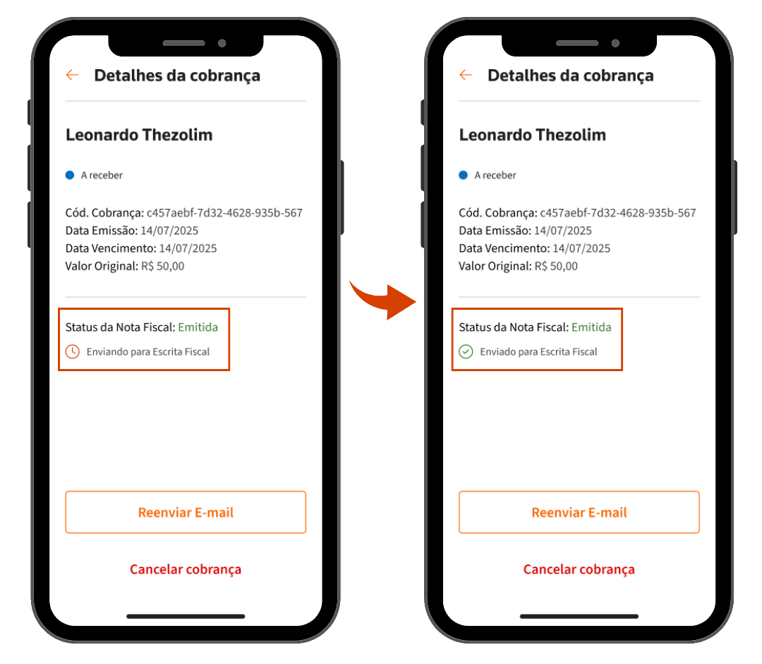8. Após corrigir, clique novamente no botão [Emitir Nota Fiscal] para que o Domínio Cobranças faça a emissão e envie para o Domínio Escrita Fiscal.