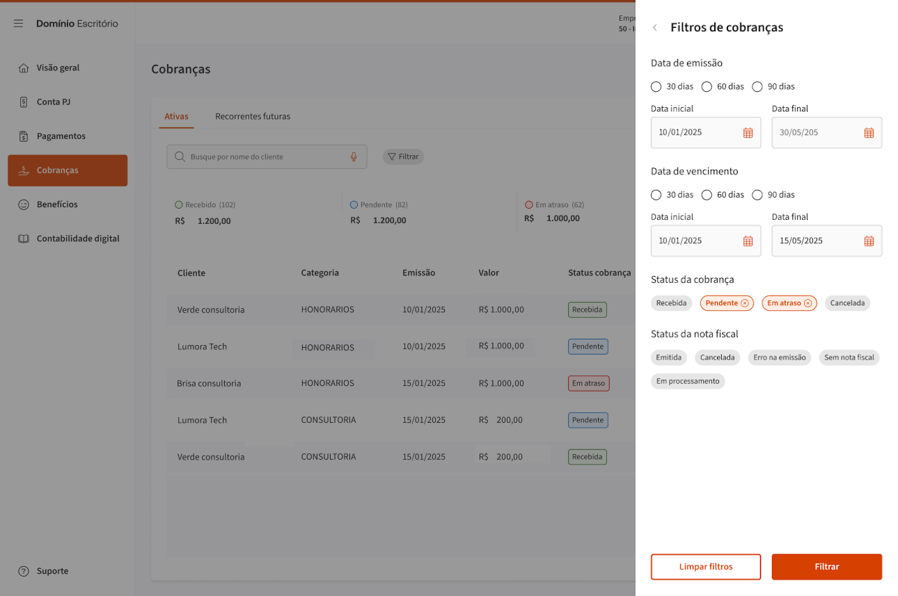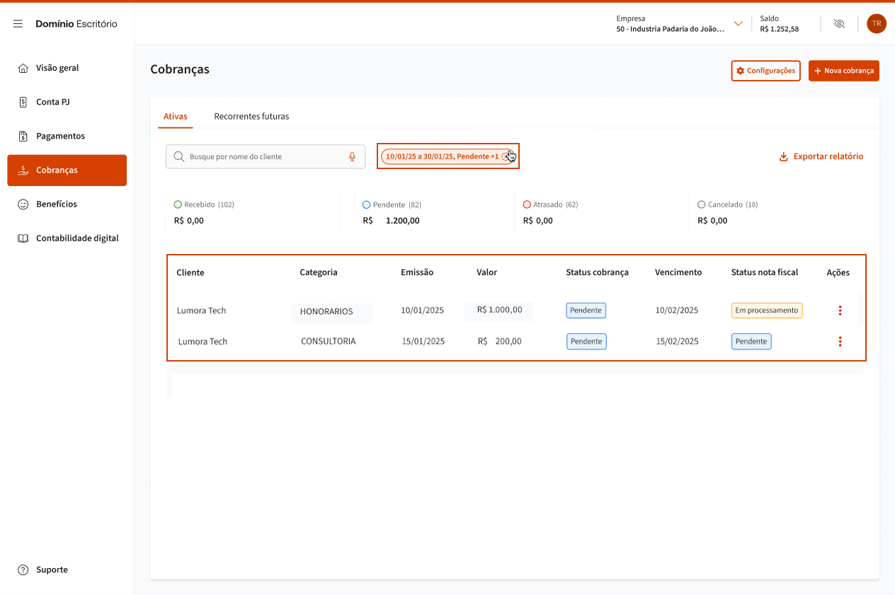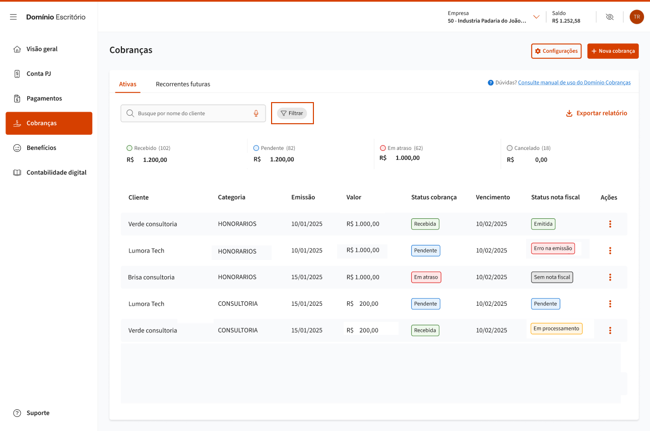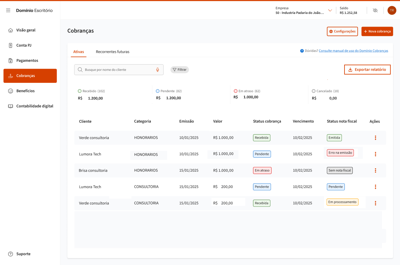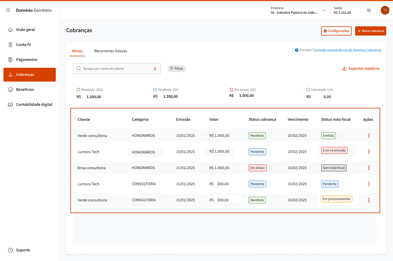 2. Todas as cobranças geradas serão exibidas, permitindo acompanhar seu status (Recebida, Pendente, Atrasada ou Cancelada) e o status da nota fiscal (Emitida, Em processamento, Pendente, Sem nota fiscal ou Erro na emissão);