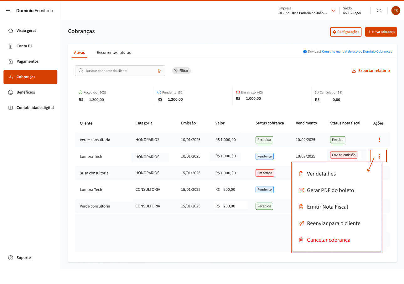 6. Na listagem, para visualizar os detalhes da Cobrança ou Nota Fiscal, clique nos três pontos disponível na coluna Ações e escolha entre as opções;