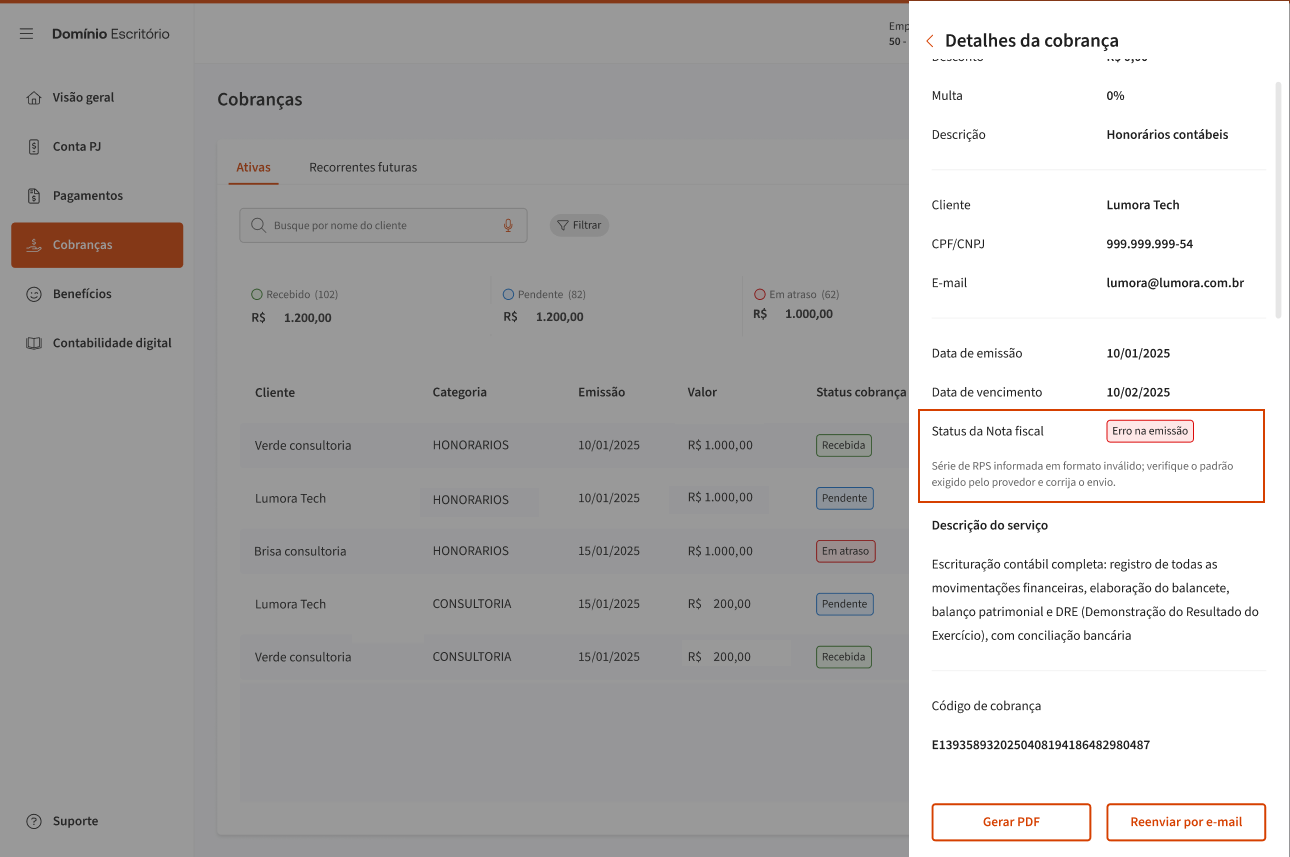 • Ver detalhes: Exibe todas as informações da cobrança, incluindo a causa de erros de emissão da NFSe;
