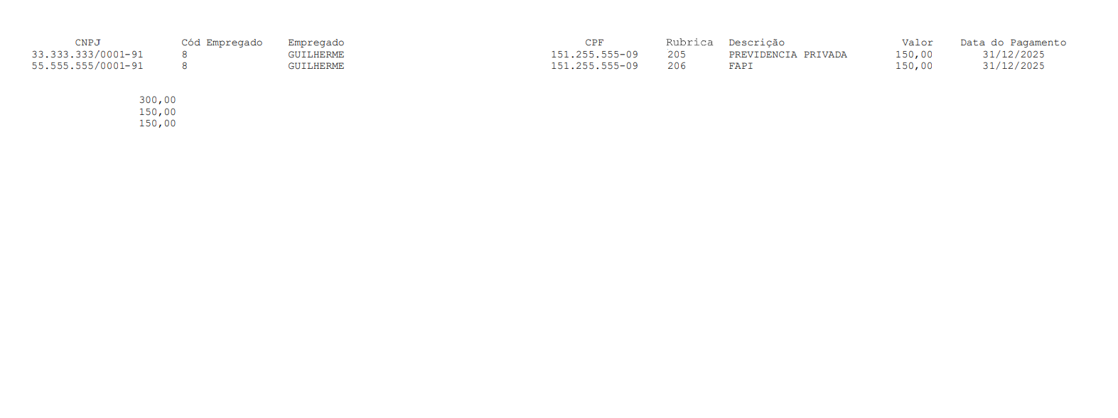 Para gerar um relatório de descontos de previdência complementar para conferência com o Extrator da DIRF, contendo as informações código, nome e CNPJ da entidade, código, nome e CPF do empregado, código e nome da rubrica, valor do desconto e data do pagamento da folha, conforme modelo