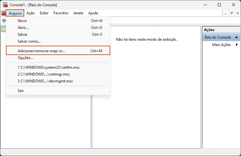 3. Clique em Arquivo > Adicionar/Remover Snap-in;