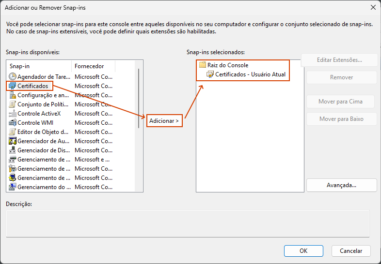 Configuração no Gerenciador de Certificados do Windows