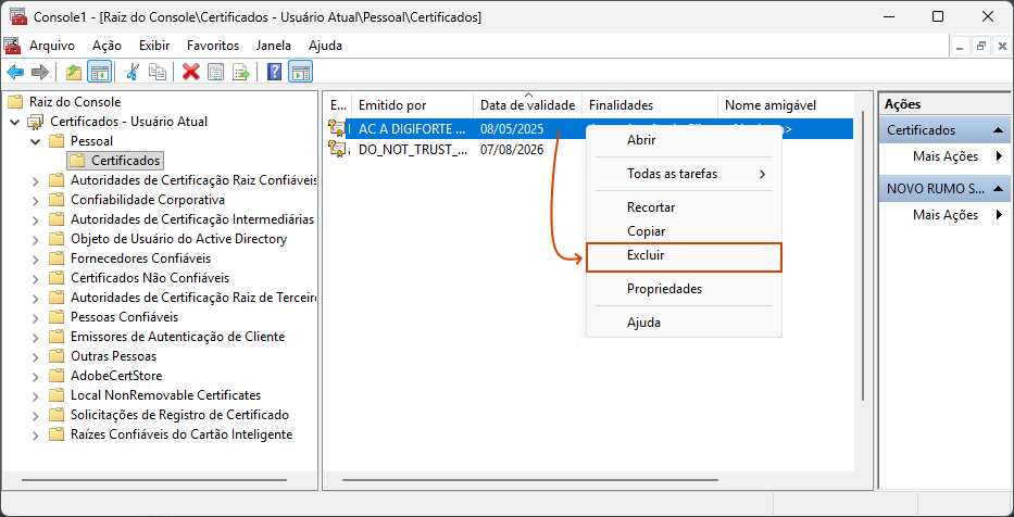7. Localize e remova os certificados vencidos ou duplicados (clique com o botão direito do mouse sobre o certificado e selecione Excluir);