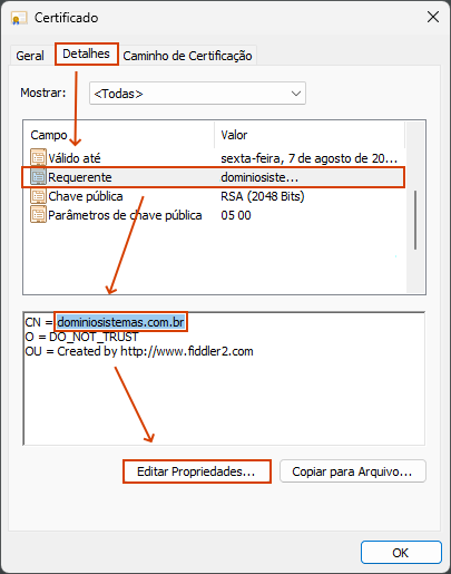 10. Localize o campo CN= e copie o nome completo do certificado que aparece após o sinal de igual (=);