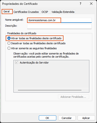 13. Marque a opção 'Ativar todas as finalidades deste certificado';