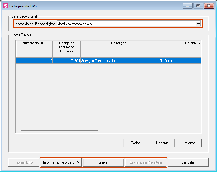 6. Na tela Listagem de DPS, selecione o Certificado Digital correto, configurado anteriormente;