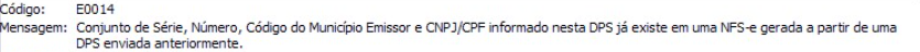 Este erro ocorre quando você gera uma DPS com um número já utilizado na prefeitura. Neste caso, é necessário ajustar a numeração da DPS no sistema para que os próximos documentos sejam gerados corretamente.