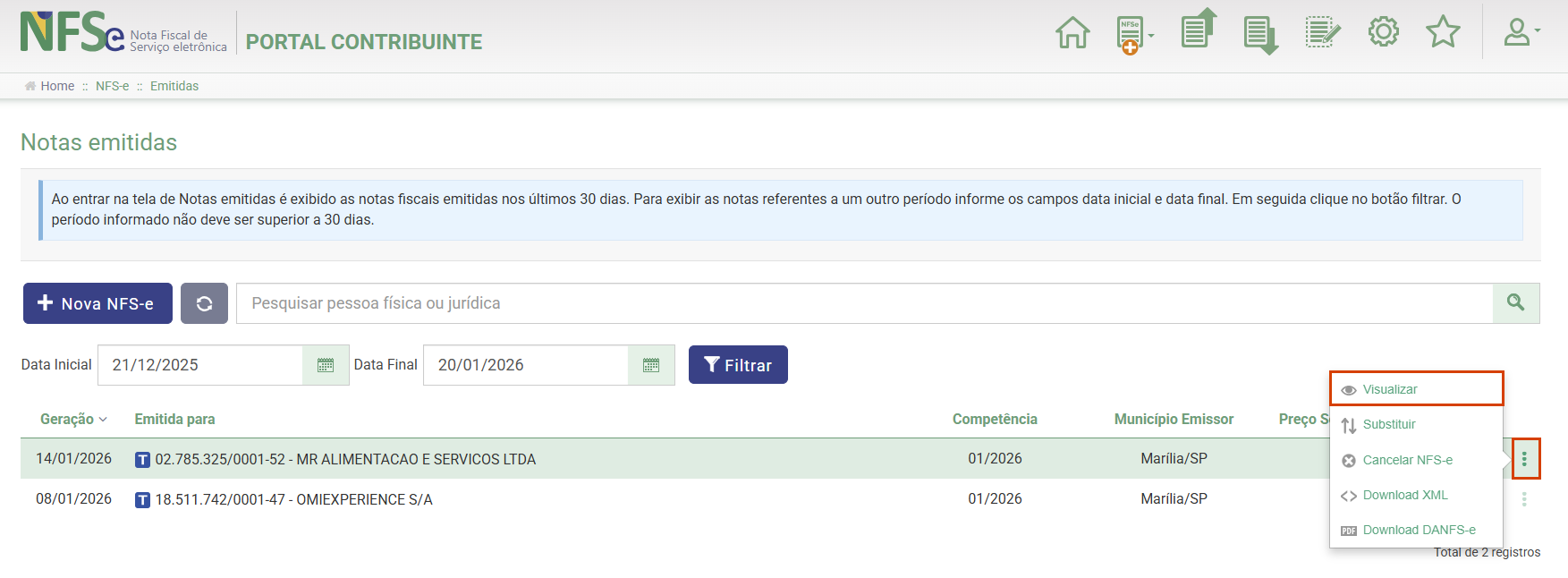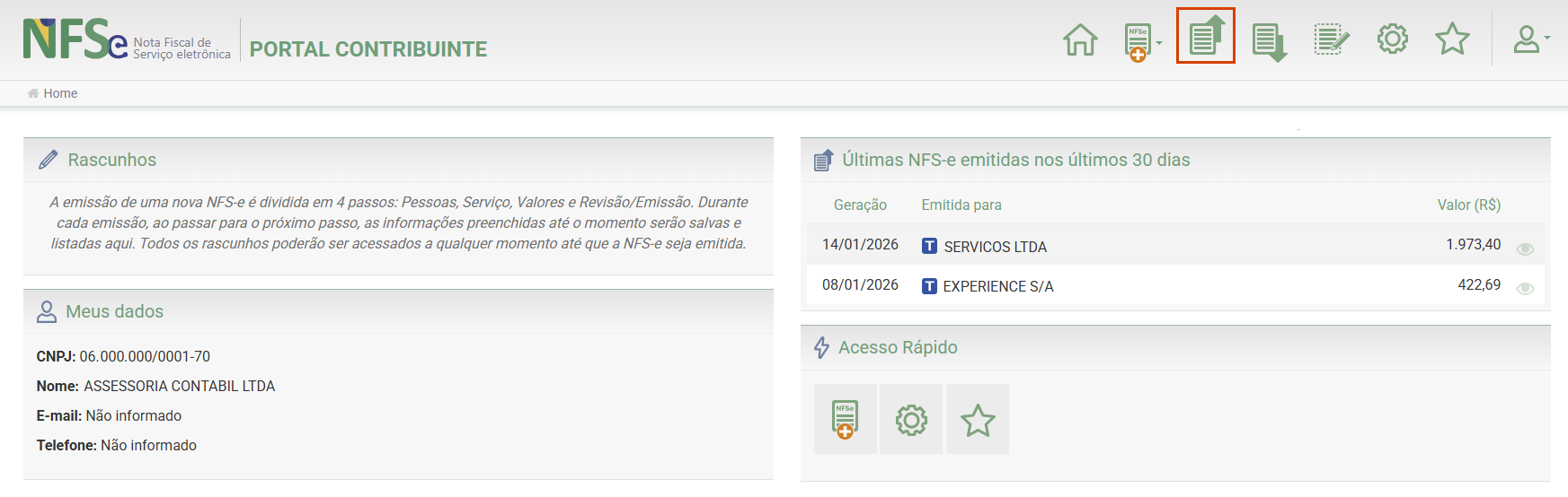 2. No canto superior direito, clique na opção NFS-e Emitidas;