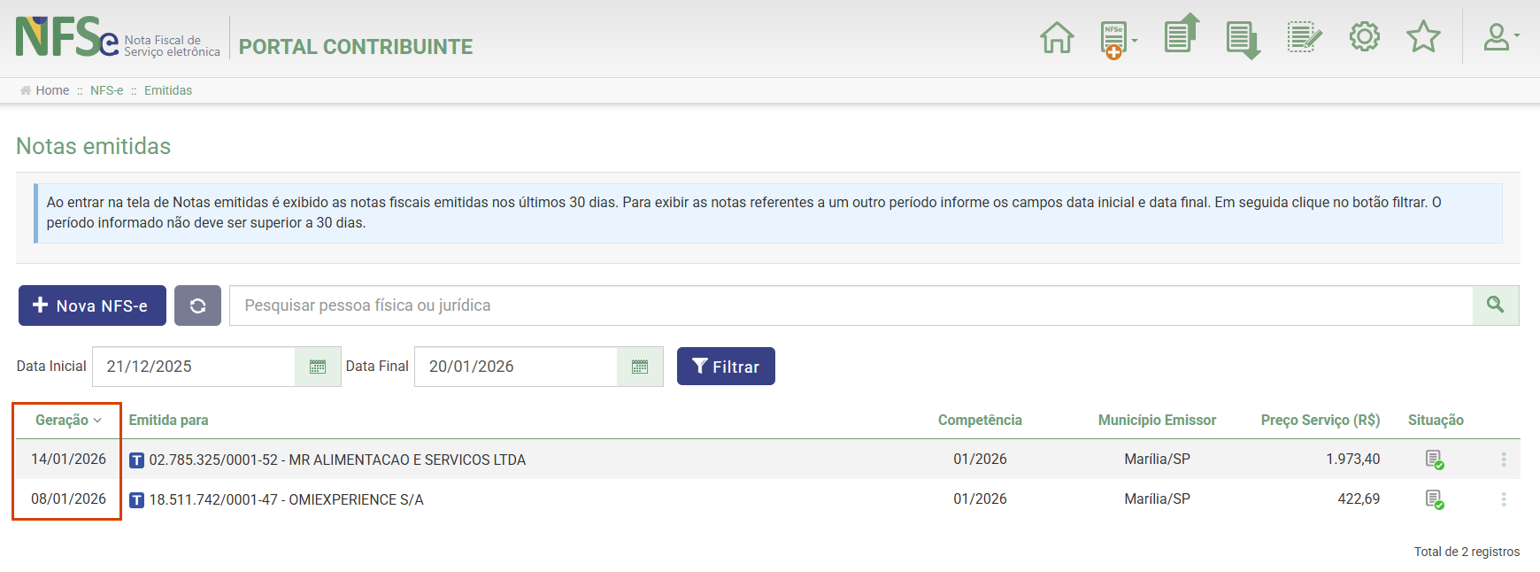 3. Localize a última NFS-e emitida. Para isso, clique na coluna Geração para filtrar em ordem;