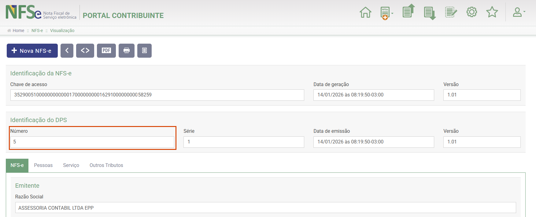 7. Clique em [Gravar] e gere novamente a DPS e envie para o Portal Nacional.