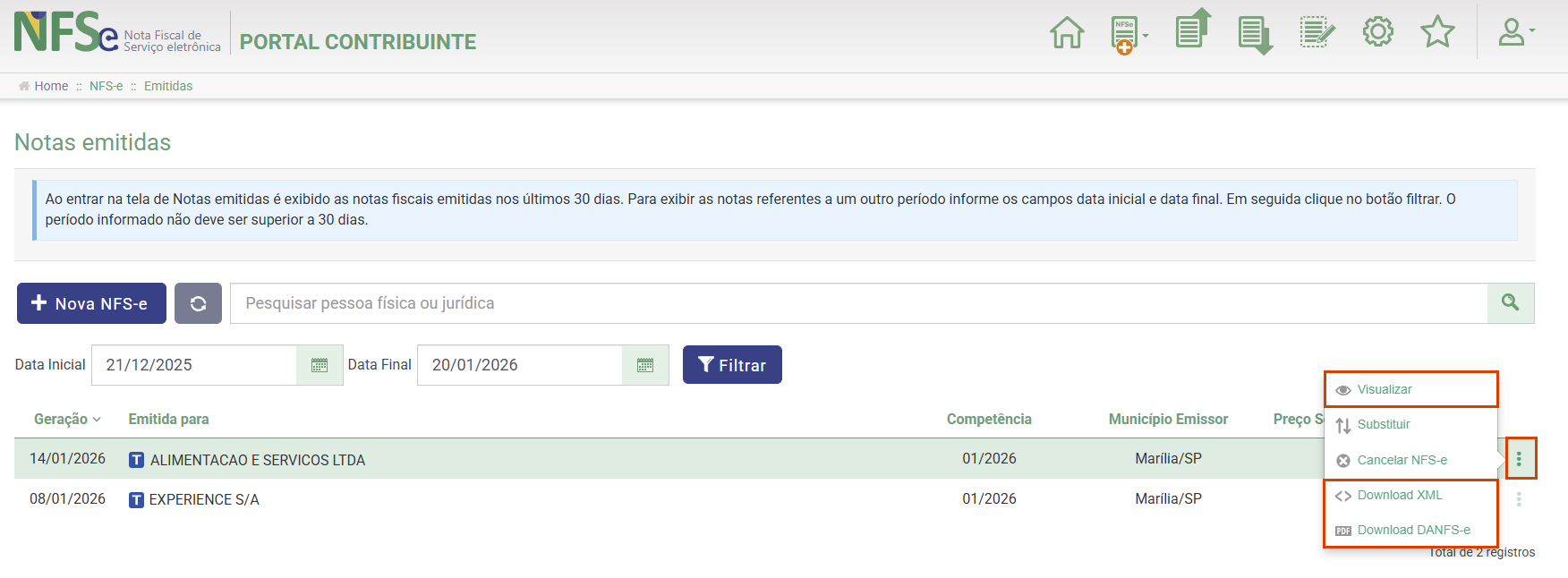 4. Após localizar, na coluna de ações, clique nos três pontos ao lado direito da página e selecione a opção Visualizar ou Download de DANFS-e;