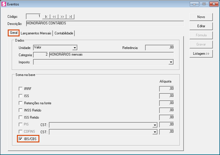 Para que o sistema calcule automaticamente os valores de IBS e CBS sobre o faturamento e demonstre esses valores na nota fiscal, você precisa configurar o evento. Esta etapa é opcional: configure apenas se desejar que os impostos sejam calculados. Como o recolhimento ainda não é obrigatório em 2026, você decide se ativa ou não essa opção. Caso não configure, os impostos aparecerão destacados na nota com valor zero.