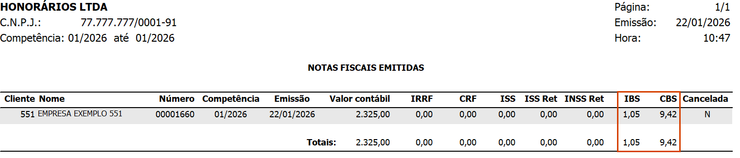 5. No relatório, serão apresentadas as colunas IBS e CBS com os valores calculados automaticamente conforme as alíquotas informadas nos Parâmetros.