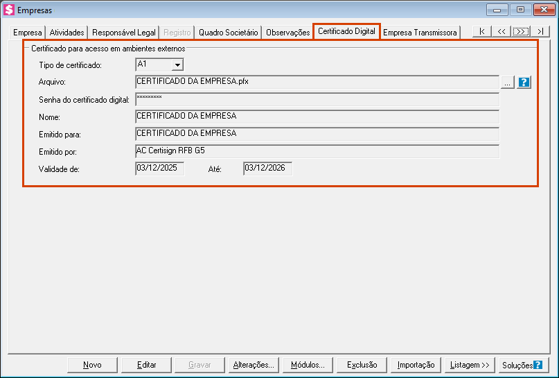 Se você utiliza o certificado da empresa para envio da DPS/RPS, deve atualizar o vínculo do certificado no cadastro da empresa para que o sistema reconheça o novo arquivo.