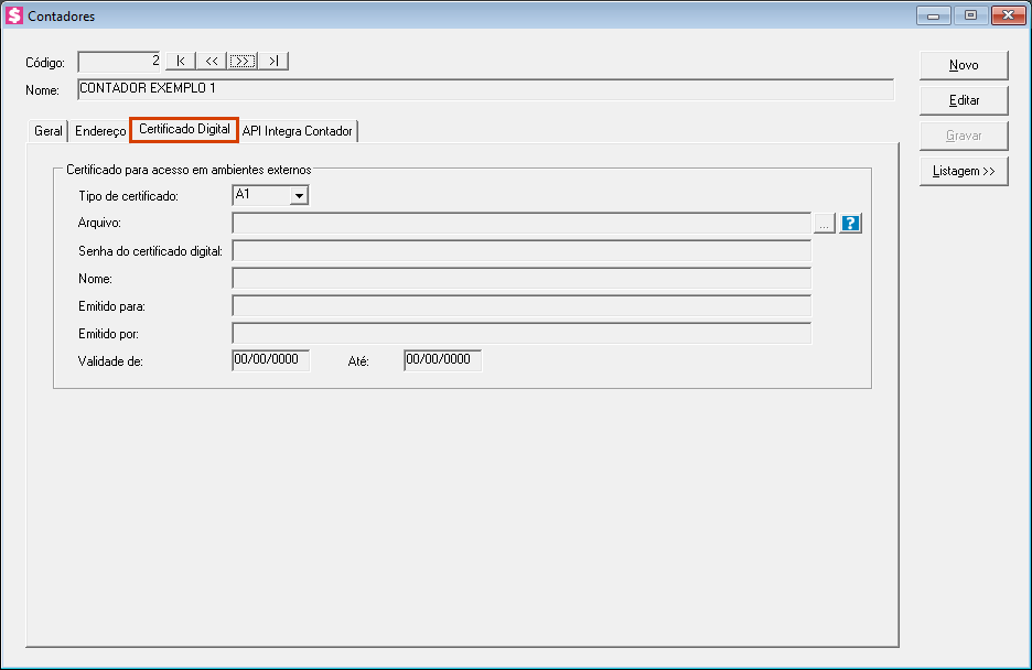 1. Acesse o menu Arquivos > Contadores e localize o contador com o certificado vencido;
