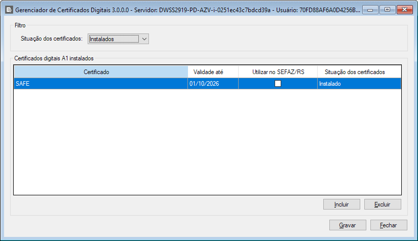 3. Clique em [Incluir], selecione o novo arquivo .pfx, informe a senha e clique em [OK];