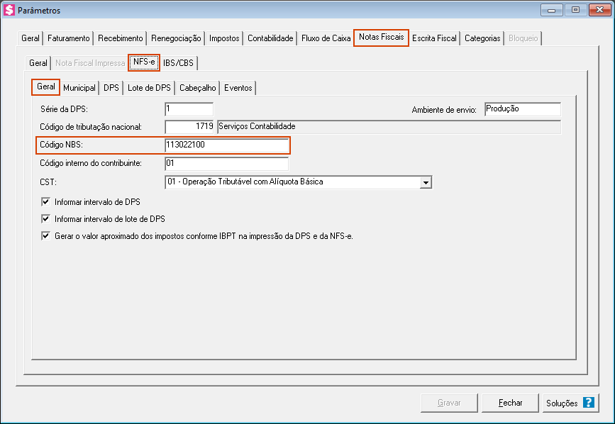 3. No campo Código NBS, informe o código correspondente ao serviço prestado (exemplo para escritórios de contabilidade: 1.1302.21.00);
