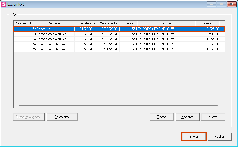 8. Selecione a DPS/RPS com erro e clique em [Excluir];