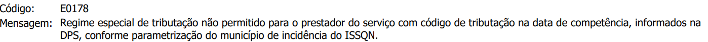 Este erro ocorre quando o Regime Especial de Tributação selecionado nos parâmetros do sistema não é compatível com o código de tributação do serviço ou com as regras do Portal Nacional da NFS-e para o seu município. É muito comum em empresas do Simples Nacional que tentam utilizar regimes específicos (como Sociedade de Profissionais) que o padrão nacional não reconhece para aquela operação.