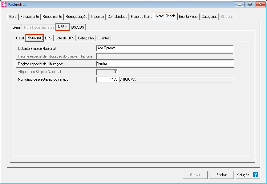3. No campo Regime Especial de Tributação, altere a opção para 'Nenhum';