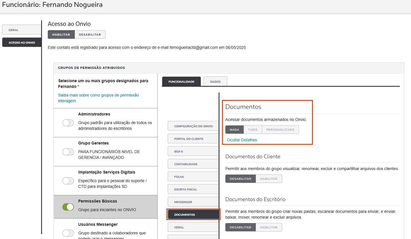 2. Acesse a guia Acesso ao ONVIO e verifique os grupos de permissões atribuídos a ele, avalie como está configurado o menu de Documentos, ele deve estar com a opção Documentos do Cliente habilitada;