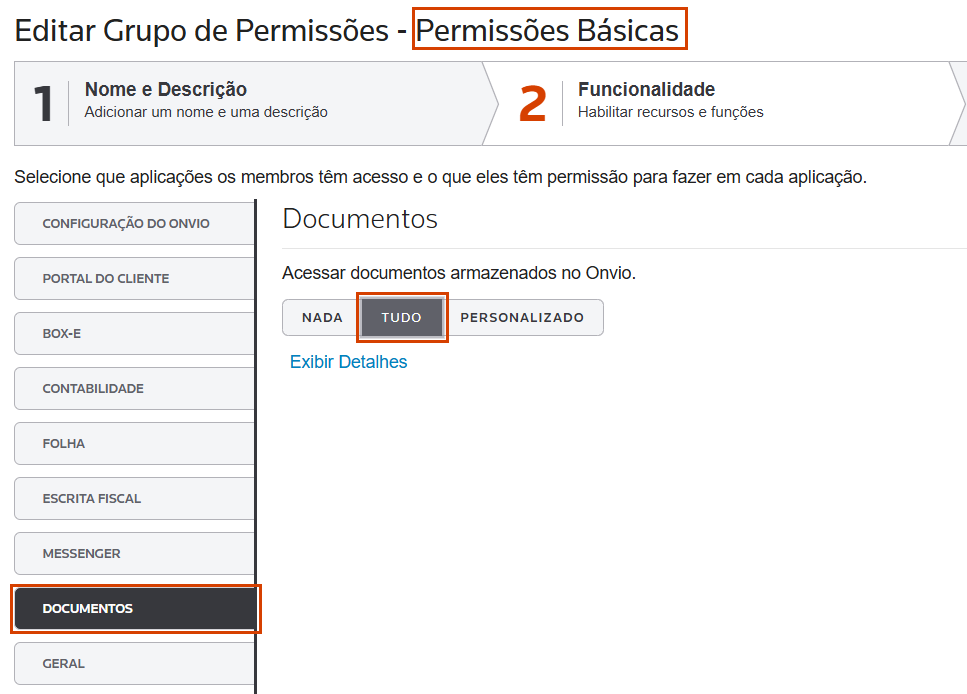 2. Ao acessar o cadastro dele, na etapa 2-Funcionalidade, avalie como está configurado o menu de Documentos, ele deve estar com a opção Documentos do Cliente habilitada;
