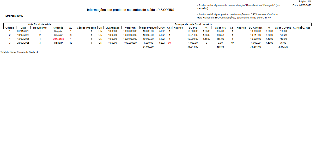 No relatório serão destacados em vermelho as notas devolvidas que tiverem um CST diferente de '49', esperado pelo validador. Também serão destacadas as notas canceladas e denegadas que tiverem informações de PIS e COFINS na guia Estoque.