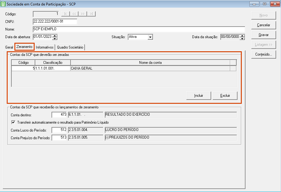 10. Na guia Zeramento, no quadro Contas da SCP que deverão ser zeradas, clique no botão [Incluir] e informe as contas para serem zeradas;