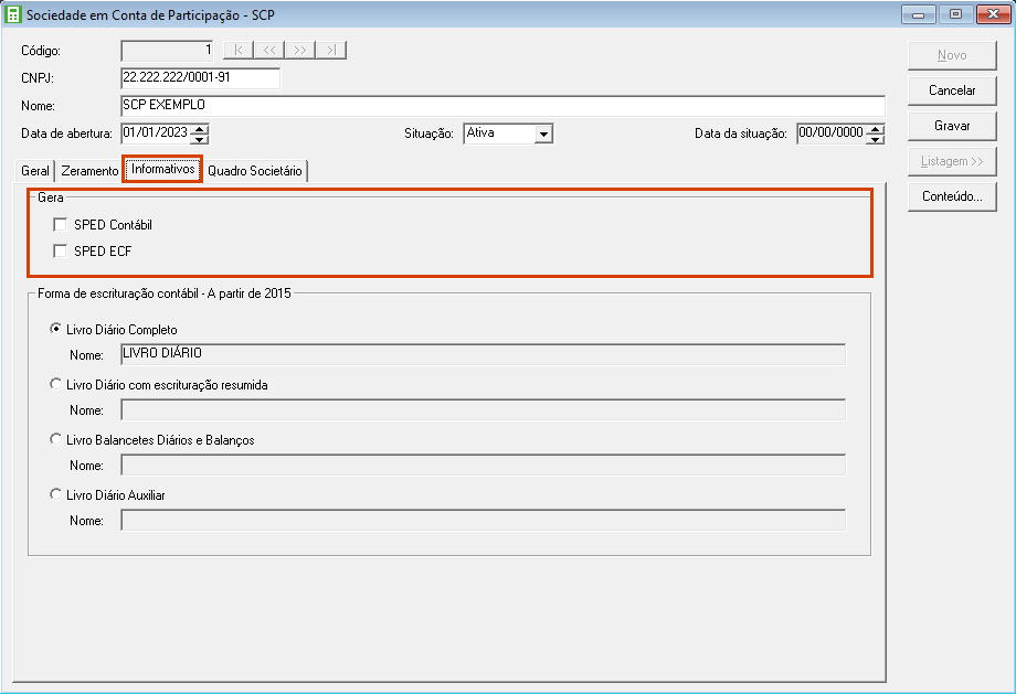 13. Na guia Informativos, no quadro Gera, selecione os informativos em que a SCP está obrigada a entrega. Esta guia será habilitada para empresas configuradas para gerar o SPED ECD e/ou SPED ECF;