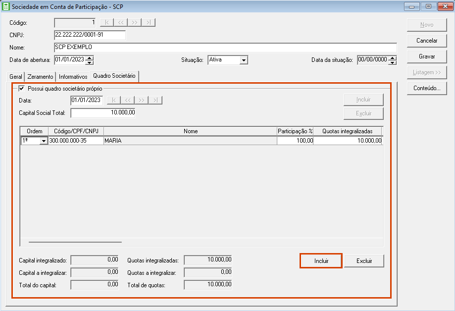 16. Clique no botão [Incluir], pressione a tecla F2 do seu teclado e selecione cada sócio previamente cadastrado em Controle > Sócios;